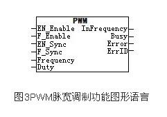 在PWM脉宽调制的功能块中,EN_Enable是外部事件触发启动PWM输出使能,F_Enable内部变量使能PWM,EN_SYNC是允许硬件触发重新启动,F_SYNC是通过内部变量重启PWM,Frequency是PWM输出信号的频率,Duty是PWM输出信号的占空比,InFrequency是PWM指定频率输出信号,Busy是布尔变量,频率或占空比发生变化输出TRUE,Error是监测错误输出,ErrID是错误代码输出。其图形语言如图3所示。