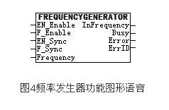 在频率发生器功能块中,EN_Enable是外部使能,若已在频率发生器通道配置,则可通过外部事件触发启动,F_Enable是通过软件变量使能频率发生器,EN_SYNC是允许外部事件重启频率发生器,F_SYNC是通过软件变量重启频率发生器,Frequency是频率发生器输出信号的频率。InFrequency是频率发生器以指定频率输出信号,Busy是布尔变量,如果设置了启用命令,并且频率发生变化,则设置为TRUE,如果设置了InFrequency或Error,或者启用命令被复位,则复位为FALSE,Error是布尔变量,TRUE表示检测到一个错误,ErrID是检测到的错误代码,其图形语言如图4所示。