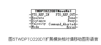 以相对值移动为例,PTO_REF_IN是输入的模块通道参考号,Execute是上升沿触发执行该功能,Distance是目标距离,Velocity是目标速度,Mode是缓冲模式,0表示中止,1表示缓冲,2表示混合先前,PTO_REF_OUT是输出的模块通道参考号,Done表示指令成功完成,Busy表示指令已被接收但还未完成,Command_Aborted表示指令已被其他指令打断,Error表示指令错误,其图形语言如图5所示。