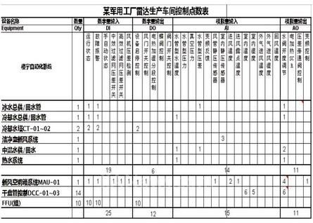 本项目是为某军用工厂雷达生产车间所做的控制系统,该系统分为水系统、空调系统和酸碱排气系统3个子系统。由于该项目生产车间的重要性,在设计中无尘室规划为万级要求千级施工设计方案。无尘室的控制精度要求为温度±0.5度,湿度为±5%。压力保持房间为+12Pa。项目的控制点数如下:
