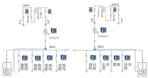 在监控系统的设计中,要充分考虑客户的实际需求,以及电力系统的实际结构、电力系统的实际载荷能力等因素,进而合理的选择监控设备,这既有利于减少系统运作的成本,同时也有利于系统功能的实现。 本项目的电力监控系统,可以实现对楼内高低压配电回路的实时监控,有利于用电管理。另一方面,电力监控系统不仅能够准确的表示出回路的用电状况,它还具备网络通讯等功能,能够与计算机、串口服务器等设备进行组合,及时的显示酒店变电所内各个配电回路的运作状态,保证其供电系统安全可靠、保障各类机电设备的正常工作、提高电力系统的管理效率、提高系统效率,降低电能消耗,延长设备寿命、节约酒店的电能花费,降低电力运行成本