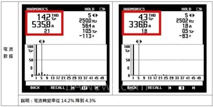 台达电源治理解决方案有效解决该医院面临的电源质量问题,治理后电流波形恢复为正常的正弦波,电压畸变率由1%降低至0.6%,电流畸变率由14.2%降到4.3%,代表电压与电流能够保持稳定,去除谐波对高精密医疗仪器产生的干扰,确保医疗仪器运作稳定可靠,使医护人员能够进行正确治疗,病患得到最完善的医疗照顾,确实降低因电力质量可能导致的医疗风险。