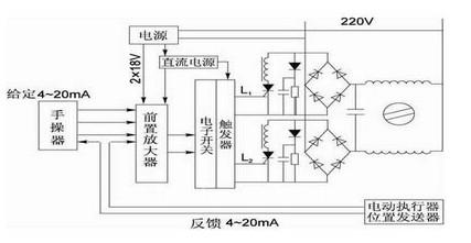 原控制原理框图如图1。手操器给定前置磁放大器4~20mA信号,前置磁放大器的线路是直流输出内反馈推挽线路,给定信号经过和电动执行器位置发送器反馈的4~20mA信号比较后,由电子开关与触发器控制电动执行器伺服电动机正转或反转;同时,电动执行器位置发送器反馈的4~20mA信号,也随之发生变化,并把反馈信号送回前置磁放大器进行比较,直到给定与反馈信号平衡为止。由于反馈信号与手操器的显示和伺服前置磁放大器串联,因此反馈与给定信号比较的同时,也在手操器上显示反馈信号的变化过程。