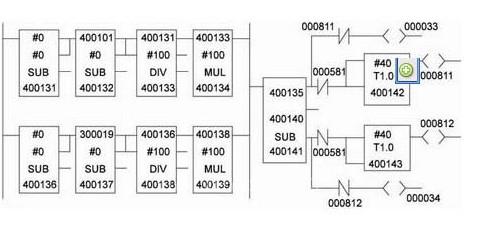 梯形图程序中“#100”是取整运算值。“100”实际是控制阀门开度的精度,即死区控制范围。在精度要求高的控制中可取“#50”或更小,它相当于伺服前置磁放大器中“稳定”电位器的作用。000581为程序中的复位线圈。“#40”为驱动输出保持40s后,自动断开输出。