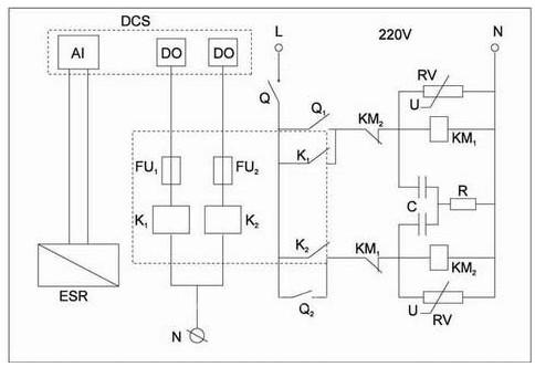 DCS:控制系统;ESR:执行器位置发送器;Q:电源低压断路器;Q1、Q2:维护、维修开关;RC:灭弧装置;RV:压敏电阻