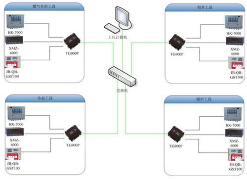 锅炉工段,智能数显表有17台(485接口)、气体报警仪8套(485接口)、火灾报警器1套(485接口),采用一台TG900P(订货时告知串口均定制为485接口),光纤收发器1台。