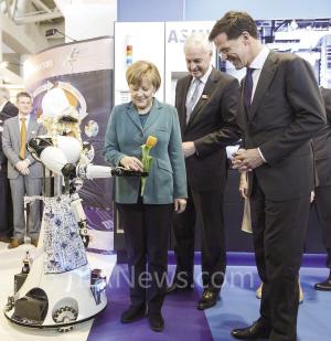当地时间2014年4月6日、7日,德国汉诺威,德国总理默克尔出席汉诺威工业展,在展览会上获得了机器人的殷勤鲜花。汉诺威工业博览会(HANNOVERMESSE)始创于1947年8月,经过半个多世纪的不断发展与完善,已成为当今规模最大的国际工业盛会,被认为是联系全世界技术领域和商业领域的重要国际活动。汉诺威工业展近年来也有越来越多的亚洲、美洲及非洲不远万里从前来洽谈,使博览会成为一个真正的全球性的盛会,并被认为全世界技术领域和商业领域的重要国际活动。