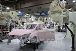 此次本公司的展品中,最大的单元是汽车车体的组装生产线。该生产线使用真实车体,在三个展示区,配置了多关节点焊机器人B系列,大型通用机器人CX系列,弧焊机器人,NC伺服定位机器人共29台。