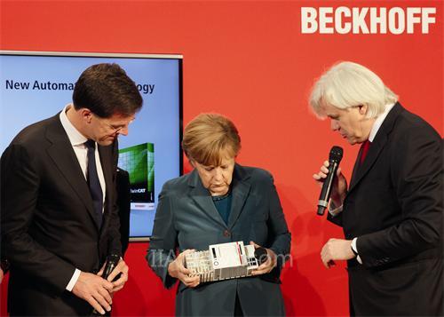 在2014 德国汉诺威工业博览会上,Hans Beckhoff 先生热情接待了德国总理安格拉•默克尔和荷兰首相马克•吕特,荷兰是今年汉诺威工业博览会的合作伙伴国。