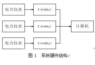 各装置安装于该电站电力控制室内,主要由T-910PLC、电力仪表、计算机、RS485数据线组成。根据各单元的资源情况和对终端功能的要求,完成硬件电路连接的设计如图1所示。
