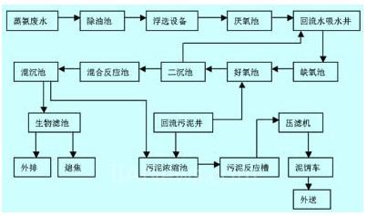 江苏沙钢集团宏发焦化厂化产车间污水处理工段主要接受来自其他工段的蒸氨废水及煤气水封水。首先进行废水的预处理,废水进入除油池,在两台批油装置机的作用下初步去除污水中油污杂物;通过气浮装置的2台污泥刮渣机去除表面的泡抹,将较小的漂浮物去除;其次进行生化处理。主要是通过厌氧池、缺氧池和好氧池进行一系列的化学反应。经过简单预处理过来的水在厌氧池、缺氧池及好氧池进行反硝化反应,炭化反应和硝化反应,降低污水中的cod、氨胆含量以及溶解氧;接下来通过加混凝剂沉淀污水中的悬浮杂质,最后进行净化过滤处理,将处理过的水在指标达标后进行排放,处理下来的污泥用带式压滤机压榨后可以作为再生资源利用。工艺流程见附图所示。