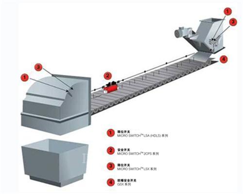 在如图所示的皮带输送机应用中,可以使用多种限位开关。
