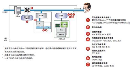 图片注释:典型的睡眠呼吸机会用到气体质量流量传感器、磁传感器、湿度传感器、温度传感器和压力传感器。