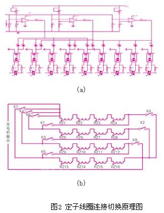 图2(a)所示为定子线圈连接切换的原理图;图2(b)为具体的切换控制电路。按照风速的大小,当转速n