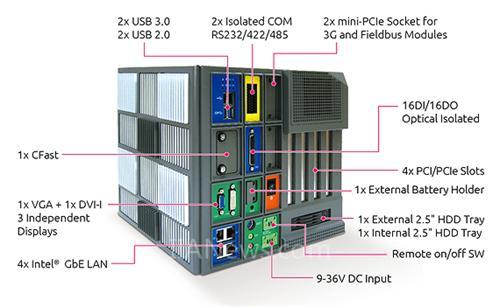 NISE 4000 系列支持 rPGA插槽式第三代 Intel 处理器,提供达35W的TDP 的高运算性能。紧凑无风扇 机箱,前插拔 NISE 4000 系列配置2个 mini-PCIe 槽和4个 GbE LAN 接口。NISE 4000 系列提供多达4个PCI/PCIe 福建卡和隔离保护的DI/O和COM 接口的前端接线。对于存储,NISE 4000 系列采用 NVRAM来防止数据丢失,并配置可插拔 HDD/SSD,CFast卡。此外, NISE 4000 系列还支持USB加密狗内部连接器。