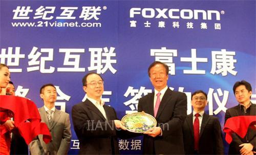 “富士康作为全球最大的电子产业专业制造商,在云端方案设计及云服务器等设备制造方面具备世界一流的研发设计和工程技术服务能力。与世纪互联的合作是富士康战略发展模式转型的重要一环。”郭台铭在致辞中表示,“我们相信双方的合作具有良好基础和广阔空间。我们期待能够将多年在技术和资源上的积累与国内相关产业进行良好的对接,实现两岸企业的优势互补和长远共赢。”