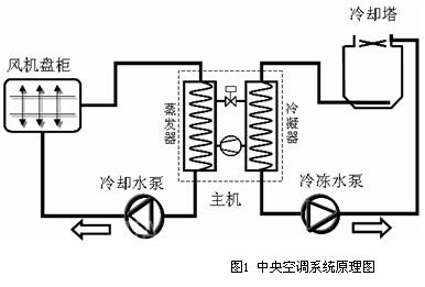 如图1所示为典型的中央空调系统图,主要由冷冻水循环系统、冷却水循环系统及冷冻主机三部分组成: