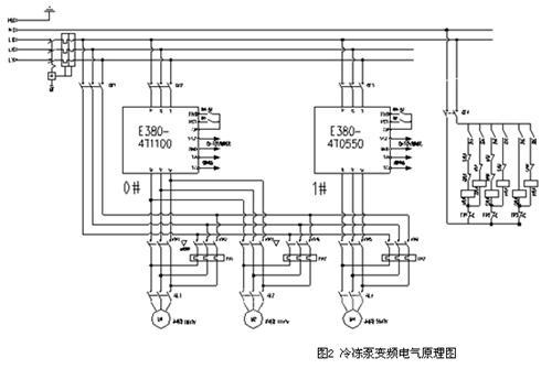 冷冻泵变频电气原理如图2所示,控制原理为:(PLC)先控制0#变频器软启动电机M1,当M1到达额定转速时,仍未达到设定温差值时,(PLC)控制M1切换工频电网运行,然后再控制0#变频器启动M2,当M2到达额定转速时,仍未达到设定温差值时,(PLC)控制1#变频器启动M3,此时0#变频器给定50HZ额定频率,主要控制1#变频器调节电机转速,控制冷冻水的循环速度;当M3工作在下限转速时,如果检测值大于设定值,(PLC)控制电机M3停机,同时控制0#变频器调节,当M2工作在下限转速时,如果检测值大于设定值,停止M1电机,0#变频器通过调节M2水泵从而达到设定要求。