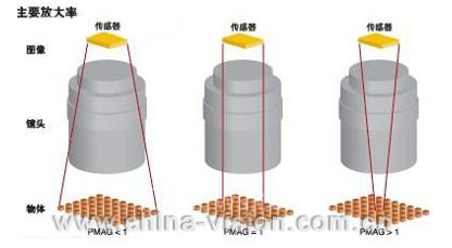 镜头放大率对于不同尺寸芯片照相机匹配镜头相当重要,然而,不要把镜头放大率和显微镜放大率搞混了,后者是由光管长度和实际物镜焦距决定的。而工业镜头放大率主要考虑的是照相机传感器的尺寸。