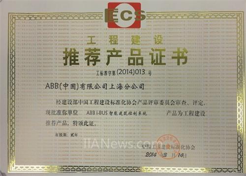 2014年3月14日,ABB i-bus智能建筑控制系统荣获了由中国工程建设标准化协会颁发的工程建设推荐产品荣誉证书。该证书的评定工作是中国工程建设标准化协会面向工程建设领域所设立的一项推荐性产品评定工作,该工作依据《中国工程建设标准化协会产品推荐管理办法》,对通过权威检测机构检测、评估、质量(环境)管理体系完善、节能效益达到国内或国际先进水平、客户反映良好的绿色节能技术与产品,组织技术专家进行评定;对申报符合要求的产品由中国工程建设标准化协会颁发《工程建设推荐产品证书》,激励企业和行业高质量增长,国内及国际多家知名品牌都参与了这次评选。