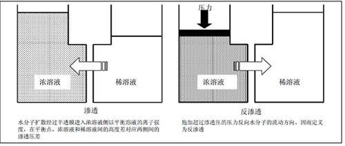 反渗透是反其自然渗透过程的一种科学方法,渗透和反渗透均是通过半透膜来完成的,当用半透膜隔开两种不同浓度的溶液时,稀溶液中的溶剂就会透过半透膜进入浓溶液一侧,这种现象叫渗透。当在浓溶液侧施加一外来压力时,渗透过程即停止,即达到所谓渗透平衡,平衡状态所需要的外加压力称为渗透压差。渗透压是溶液本身的一种性质,其值与膜无关。当继续增大浓溶液一侧的压力,即所施压力大于渗透压力时,溶剂会反其原来的渗透方向,由浓溶液侧通过半透膜进入稀溶液侧,这种现象称为反渗透,如图1。