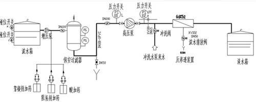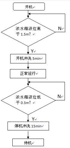 2)反渗透装置自动停机,停机低压冲洗:浓水箱液位低于设定值时(暂定0.3m),执行停机程序。先停止高压泵、增压泵,再打开冲洗进水阀、浓水排放阀,启动冲洗泵进行低压冲洗,冲洗15分钟后,先关闭浓水排放阀,再关闭冲洗进水阀,关闭冲洗水泵进入待机状态。