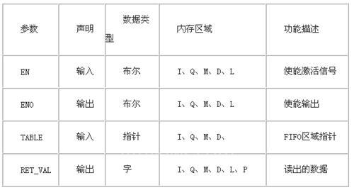 从图2-1中可以看到,FC85FIFO共有四个参数,分别为EN、ENO、TABLE和RET_VAL,在西门子资料中对其描述如下表2-2: