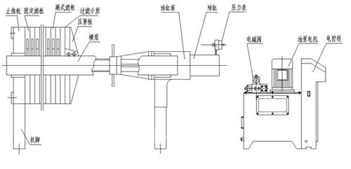 c. 压紧:油泵电机运转,压紧电磁阀得电,液压站往油缸高压腔供油,活塞杆带动压紧板前进,从而推动滤板执行压紧动作,当滤板与止推板相接触时,液压系统压力上升,当达到设定压力上限值时压滤机自动转入保压状态。