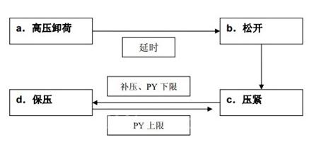 a.高压卸荷:当投料过滤过程完成后,按“程序启动”按钮,启动压滤机开始卸料,高压卸荷阀将油缸内的高压卸掉,以防止压紧板松开时液压系统受冲击。高压泄荷时间由 PLC 控制,当延时时间达到后,压滤机自动转入压紧板松开状态。