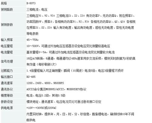 - 电流量程:基本量程0~5A,可通过外加电流互感器及设电流变比测量较大电流