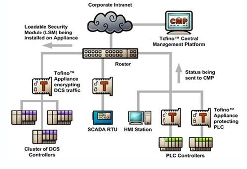 Tofino模块采用Tofino Central Management Platform (CMP,中央管理平台)进行集中配置、组态和管理(可远程甚至跨国使用),控制系统网或企业网均可以在适当位置安装CMP。使用CMP,并装载各种必要的Loadable Security Modules (LSMs,可装载安全软件插件),就可以实时在线调整Tofino模块,使之满足所保护区域及设备的安全要求。