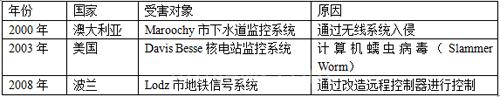 其实,自从进入21世纪之后,就已经出现了很多相关事例。比如,澳大利亚下水道监控系统和美国核电站监控系统曾被第三方经由无线网络系统侵入,波兰地铁信号系统被入侵(见表1)。近年来,这样的攻击案例正在迅速增加。
