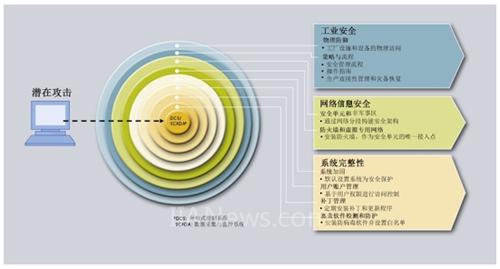 目前,以西门子为首的工业控制系统信息安全产品和服务提供商,普遍提倡在工业控制系统信息安全解决方案中采用“纵深防御”的策略。图1为西门子安全工控系统的“纵深防御”示意图。从图中不难看出,西门子基于纵深防御的安全工控系统的特点在于,在外部世界的威胁和工控网络之间建立尽可能多层次的防护,通过部署多层次、具有不同针对性的防护措施,保护关键的工业自动化控制过程与应用的安全。