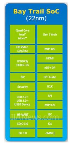 大联大控股品佳代理的Intel Bay Trail-T包括了Z3740、Z3770等是四核处理器,主频分为1.8Ghz, 2.0Ghz 和2.4Ghz,是首个同时支持 Windows 8 与 Android 系统的移动平台,终端产品尺寸可从 7 英寸到 11.6 英寸,最高支持的分辨率高达 2560×1600,厚度可压缩至 8mm。