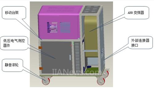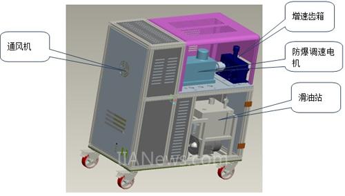 移动式电传装置由移动台架、滑油站、防爆调速电机、增速齿箱、ABB变频器、低压器件等组成。结构如图1、图2所示。