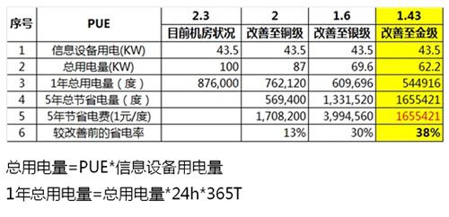 以一个总功率100kW的机房为例,PUE从2.3改善到1.43,一年能节约30多万度电,5年就可以节约165万元的电费,为企业更高效的运营提供有力的支持。