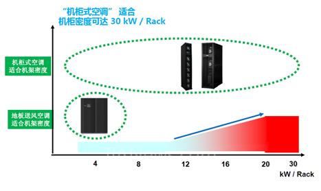 从图中,我们可以看出传统下送风空调,满足单机柜6kw一下的需求,而水平送风空调可满足单机柜30kw一下的需求。