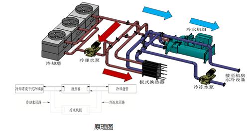 自然冷却技术就是利用免费的自然资源进行热交换,最大限度的降低机房能耗,目前常用的免费冷源主要是冬季或春秋季的室外空气。因此,如果可能的话,数据中心的选址应该在天气比较寒冷或低温时间比较长的地区。在中国,北方地区都是非常适合采用免费制冷技术。采用水冷空调系统,当室外环境温度较低时,在低于15度以下(上海地区每年约有120天)就关闭制冷机组,可以利用冷却塔、冷却水泵、板式换热器组成的系统进行热交换,因系统中没有大功率的压缩机运转,极大的降低了系统的效率,当温度高于15度又切换回冷冻水系统。上述介绍的水冷自然冷却由于只需要增加一台不需要动力的板式换热器,投资和占地都比较少,是我们推荐的企业数据中心最佳免费制冷节能方案,系统的原理图如下。