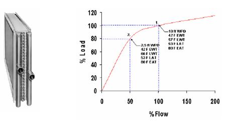 实现节能的原理:低流量大温差与热交换能力的关系,对于一个换热器(板换或者精密空调表冷器)来说,其流量与温差的关系见下图,在部分负荷下,其冷量与流量不会同比下降,如图,在50%的流量下,可以提供大约80%的负荷,也就是说系统的冷量与流量不会完全对应,但是每个厂家的换热器性能不一定,故最佳换热流量并不统一,这个最佳流量基本会在30%-70%之间,使得温差最大会高于5℃。