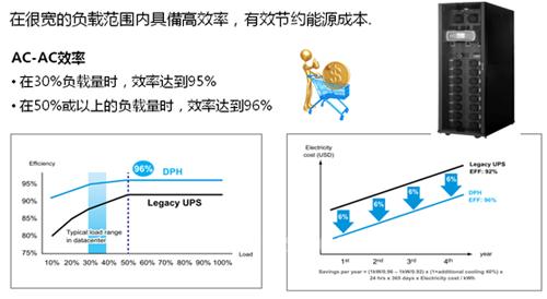 ■ 采用转换效率高的UPS系统。目前,新一代数据中心的设计基本采用新型的高频(IGBT技术)UPS系统,电源转换效率和功率因数都比传统的工频(可控硅技术)UPS系统有非常大的提升,而且重量轻和体积小。由于UPS的电源转换效率和负载率成正向关系,因此在设计和运维时要尽可能提高UPS的负载率。