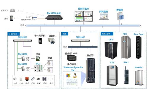 主要监控架构为EMS3000, 藉由以太网络(ethernet)架构SNMP协议整合台达设备及监视, 消防等外部组件, 及监视具备IPMI协议内部之服务器之内部风速及温度状态,结合对服务器芯片及灯光控制的管理,实现虚拟化节能及照明节能。