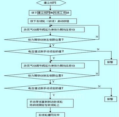 主控单元工控机的控制程序主要采用Step7软件进行编写,同时使用VB脚本和C脚本编写和组态了人机界面程序,该程序采用模块化编程结构,便于系统维护和扩展。由于系统软件逻辑运算和数学运算的复杂性,限于篇幅,下面只列出放线轮建立线网过程和主程序的程序流程图[5][6]
