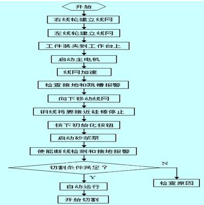 自动切割过程如下,首先建立线网,从放线轮开始,放线轮建立起张力后,操作人员用专用的工具拖动切割钢线,绕导轮转动将钢线编织成所需的网状方式,一直到收线轮,将钢线固定在收线轮,然后按下收线轮启动按钮,收线轮建立张力。接着将工件装夹到工作台,启动主电机,同时按同步控制方式启动从电机、导轮电机,点动升速按钮,线网低速运转,操作人员检查接地和跳槽报警功能,正常后,向下移动线网,当线网要接近工件时,按下初始化按钮。启动砂浆泵,使能断线检测功能。当切割条件,如切割张力,砂浆流量、温度,冷却水流量、温度等达到切割要求是,按下自动运行按钮,开始切割。