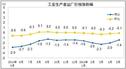 2014年5月份,全国工业生产者出厂价格同比下降1.4%,环比下降0.1%。工业生产者购进价格同比下降1.8%,环比下降0.1%。1-5月平均,工业生产者出厂价格同比下降1.9%,工业生产者购进价格同比下降2.1%。
