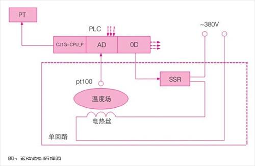 以单区温度测量为例,每个单区的型腔内设置两个测温点,每个单区的控制点温度测量使用2个欧姆龙公司的e52-p10ae型pt100热电阻,测量的最高温度可以满足温控系统的工艺要求,由于叶片成型模具型腔内测温不导电,故pt100无需安装绝缘套管。同时,采用pt100型热电阻测温可以有效避免采用热电偶作为传感器所产生的冷端补偿误差,提高温度测量的精确度。4通道输入模块cj1w-ad04u进行温度数据采集。