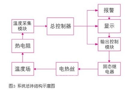 该多路温度控制系统应主要具有4个方面的基本功能,即实时控制功能、显示功能、数据处理功能、报警和故障处理功能[4]。根据上述系统的主要功能,对该多路温度控制系统的总体结构进行设计,系统总体结构示意图如图3所示。整个温度测控系统的硬件包括数据采集模块、输出控制模块、热电阻、固态继电器、人机界面及总控制器等。下面分别从温度传感与采集,总控制器以及执行机构三部分介绍该系统整体体系结构。