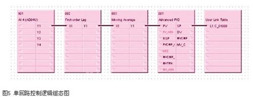 用户窗口用于实现数据与流程的可视化。主界面显示当前的温度值、设定的模具型腔恒温控制精度,模具型面温度偏差以及当前的控制状态;设计了曲线显示窗口分别显示每个温度控制点和组对象的实时曲线和历史曲线;温度控制点设置和温度运行控制窗口通过hmi的实时显示后可以供操作员手动进行各通道的加热升温、冷却降温、恒温保持、启动和停止等一系列动作。每个单回路在工控组态软件中的控制逻辑组态图见图5。