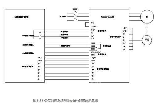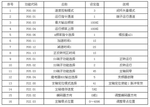 数控车床主轴电机需要变频器在起停时要快且平稳,电机无尖叫声,无明显抖动。转矩响应要快,稳速精度要高;抗干扰能力强,同时维修要方便。电机最大转速要求达到3000r/min,现场速度脉冲编码器安装在车床主轴上面,车床主轴和主轴电机之间通过同步皮带连接,且皮带输入输出带轮直径比值为1:1。同时,车床主轴要求实现定位控制,当一个工件加工好后,车床主轴要回到初始位置,此时,将加工好的工件取下,重新装上一个待加工工件。针对上述工艺要求,我司特选用高性能闭环矢量主轴定位专用变频器Goodrive35,功率等级为4KW,型号为GD35-004G-4-A1。