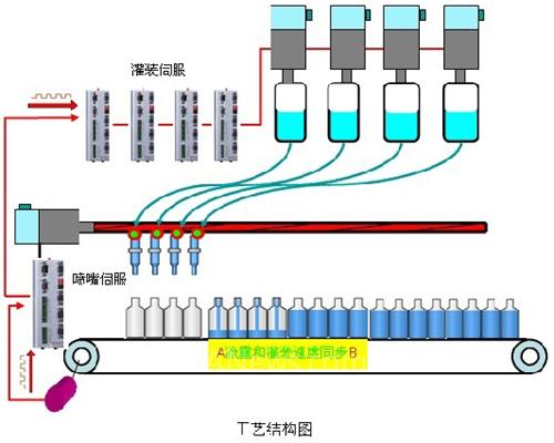 喷嘴伺服及灌装伺服同步工艺的实现: