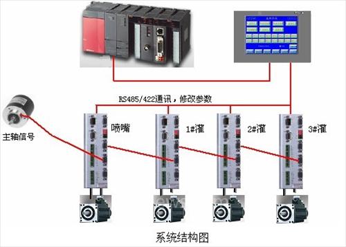喷嘴伺服驱动器encoder out接口输出送料电机电机编码器信号,反馈到灌装伺服驱动器 master encoder(主编码器输入)中,以此类推接入其余的伺服。系统结构示意图如下